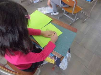 カッターナイフを使って切込みを入れたり,窓を開けたりしました。子ども達は安全に気を付けてカッターナイフを使っていました。