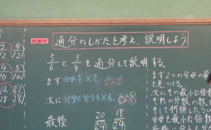 通分の学習です。分数のたし算やひき算の計算をする際に大事になってきます。どうしたら確実にスムーズにできるか,みんなで考えました。