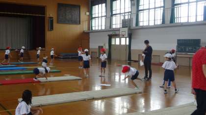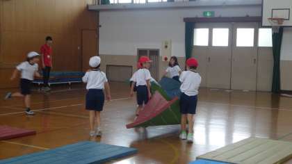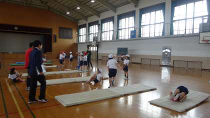 マットあそびに取り組んでいる2年生。今日も各自,しっかりとめあてをもって頑張りました。今日の学習でできるようになったことは,友だちにも確認してもらいました。準備や後片付けも友だちと協力して,スムーズにできています。