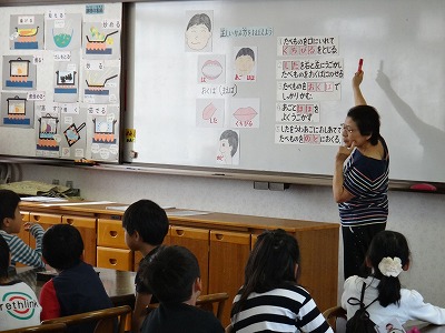 栄養教諭の澤島先生に、正しい噛み方について教えていただきました。「みんなは、お顔のどの力を使って、物を噛んで食べているだろう?」ということから考え、奥歯で30回ぐらい噛んで飲み込むことを知りました。口やべろの動かし方も、実践しました。