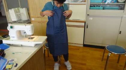ミシンを使ってエプロン制作を進めてきましたが,ようやく完成してきました。苦労して作ったエプロンを使って,今度は調理実習ですね。