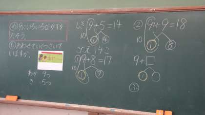算数では繰り上がりのたし算の学習をしています。10のかたまりを作って考えていきます。家庭学習の際には,どのように考えて問題を解いているのか,一緒に考えていただけたらと思います。