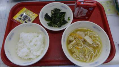 今日の献立は「ごはん(減量)・牛乳・かやくうどん・ほうれん草の煮びたし・黒大豆」でした。かやくうどんは,鶏肉・油あげ・にんじん・はくさいの具であっさりとして,だしの味がしっかりきいていました。青ねぎが台風21号の影響で調達困難になり,使えなかったのが残念でした。「ほうれん草の煮びたし」は「えのきだけ」と一緒にだし汁とみりん・しょうゆで煮て仕上げました。