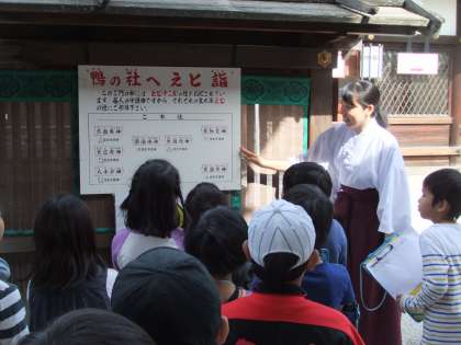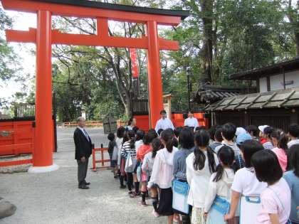 総合的な学習の時間に下鴨神社について調べています。今日は下鴨神社に探検に行き,下鴨神社の方たちに神社を案内して頂きました。