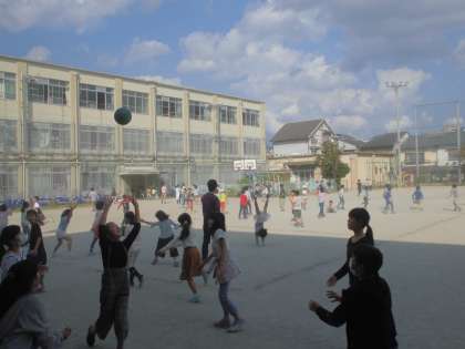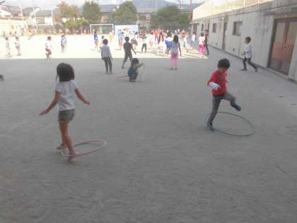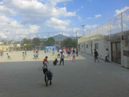 秋晴れのいい天気です。昼休みにはたくさんの子ども達が運動場にでて遊んでいました。クラスでドッジボールをして遊んだり,フラフープや一輪車で遊んだりする子ども達がいました。
