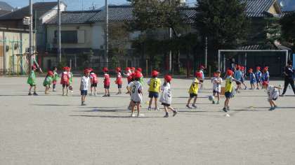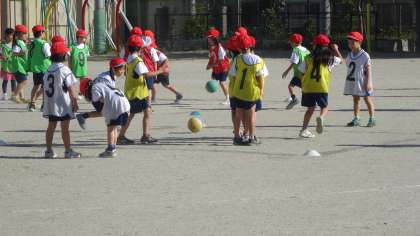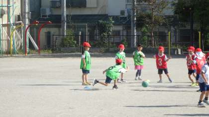 今日は本当に良い天気になりました。その好天のもとで,元気にころがしドッジをしました。