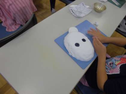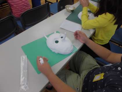 続いて子ども達は耳や角等をつけて各自が思い思いのお面を作りました。子ども達は大変楽しんでお面を作っていました。