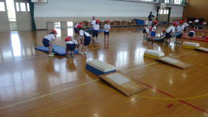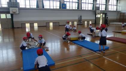 1年生は体育でとび箱の学習がスタートしました。まずは,準備や学習の進め方,体ならしの方法をみんなで確認です。体ならしでは,跳び箱をこわがらずに跳べるように,ウレタンマットを使ってダイビングの練習をしました。