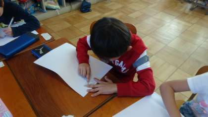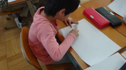 先日の宝が池公園への校外学習で集めてきた落ち葉を使って,写し絵を楽しみました。力加減を考えながら,うまく写し出せるように頑張っていました。