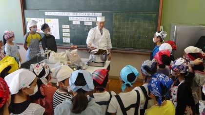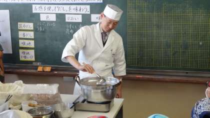 日本料理に学ぶ食育カリキュラム推進事業の取組で,地域の料亭の方をゲストティーチャーとしてお招きして,だしの学習をしました。