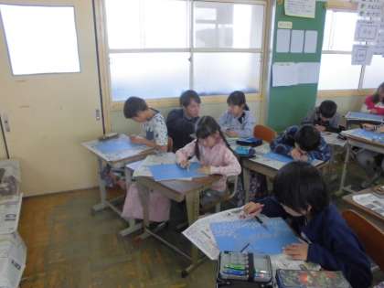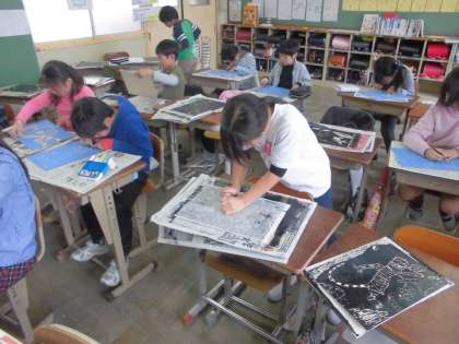 木版画に取り組んでいます。版を彫り終わった子どもは刷り始めました。インクをローラーにつけて力を入れて版にインクをつけました。力作が出来上がりました。