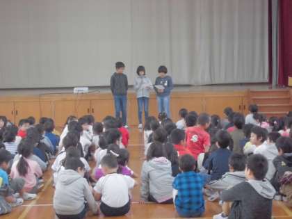 朝会の最後に環境飼育委員会からペットボトキャップの回収について話がありました。