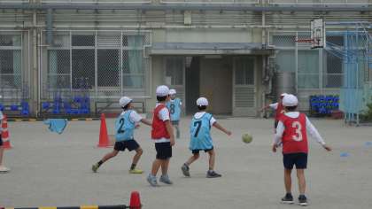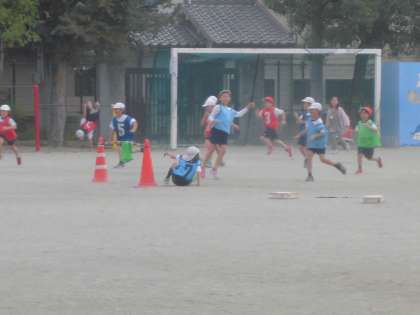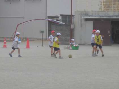 ボールけり遊びの学習をしました。子ども達は元気よく動いてシュートを狙っていました。