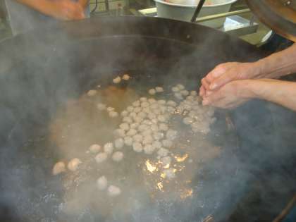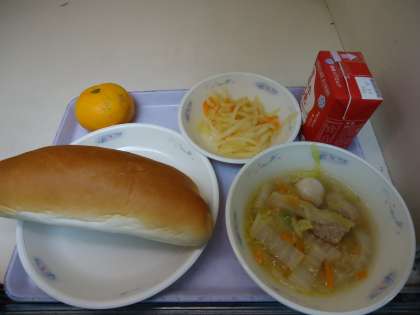 今日は「味つけコッペパン・牛乳・肉だんごのスープ煮・じゃがいものピリ辛いため・みかん」でした。肉だんごは,豚ひき肉・たまねぎ・しょうがに片栗粉や調味料を加えてよく練り,小さなだんごにしてスープの中に入れていきました。はくさいやにんじん・春雨の具にも肉のうまみがしみこんでおいしくなりました。じゃがいものピリ辛いためは,いつも人気がある献立です。トウバンジャンのピリっとした辛さと米酢の酸味がきいていて食欲を高めます。季節のくだものの「みかん」も「あまずっぱくておいしい」と好評でした。