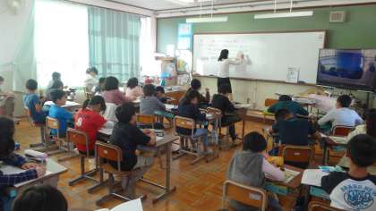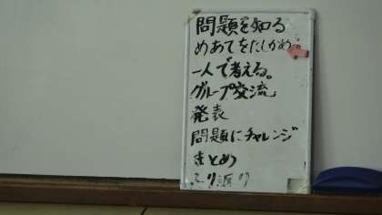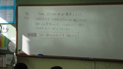 4年生の算数の授業の様子です。1時間の学習の流れも小さい黒板に示されていて,見通しをもって学習を進めています。