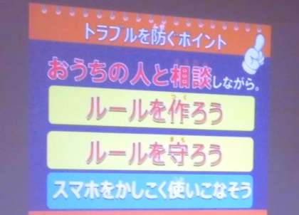 携帯電話会社の方をゲストティーチャーにお招きして,スマホの正しい使い方について教わりました。スマホはとても便利な道具ですが,使い方を間違うとトラブルのもとになるだけでなく,依存症等の問題も発生してきています。お子様に携帯電話を持たせる場合には,前持って子どもと話合いをし,しっかりルールを決めて正しく使えるようにしてください。