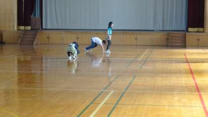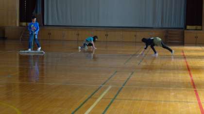 体育館の掃除をのぞいてみると,一生懸命に雑巾とモップで床をみがく5年生の姿がありました。広い体育館を少ない人数で頑張って掃除してくれています。