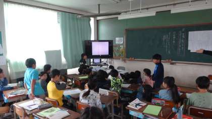 「プラタナスの木」の学習をしている4年生。今日は,登場人物の行動や気持ちの変化について,自分が考えたことを大型テレビに映し出しながら交流しました。