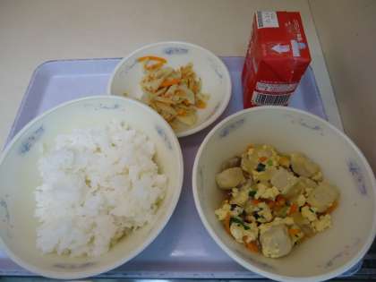 今日の献立は「ごはん・牛乳・高野どうふの卵とじ・根菜のごまいため」でした。高野どうふは,昔から食べられてきた保存食品です。かんだ時にじゅわっとでてくるだし汁の味を味わって食べてくれていました。たまねぎ・にんじん・生しいたけ・細ねぎと一緒に卵でとじて仕上げました。「根菜のごまいため」は,れんこん・ごぼう・にんじんを炒めて,さとう・みりん・しょうゆ・米酢で味付けし,いりごまを加えて仕上げました。甘酸っぱい味とごまの香りがおいしかったです。