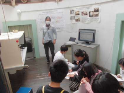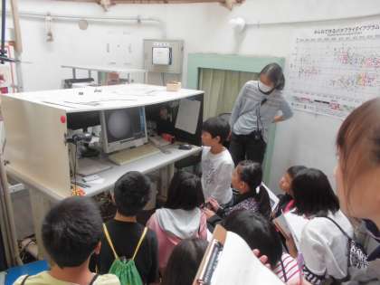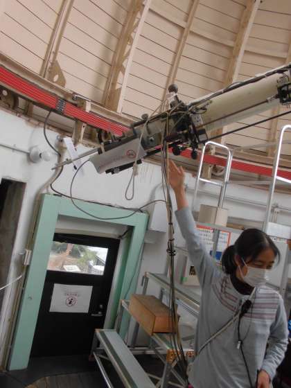 別館では太陽の観測に使われている望遠鏡の説明を聞きました。今日は曇り空の為太陽の観測ができなかったので,コンピュータに保存されている晴天時の太陽の画像を使って黒点などの説明をしていただきました。