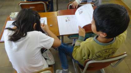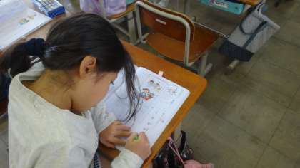 新出漢字の学習です。今日は「妹」という感じを学習しました。「妹がいる人?」と聞くと,「妹,いるよ。」「弟もいるよ。」と教えてくれました。楽しみながら漢字も覚えていっています。