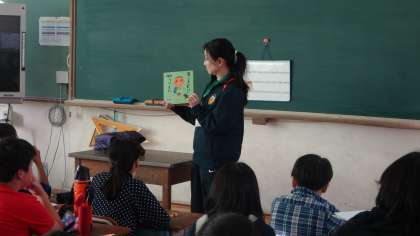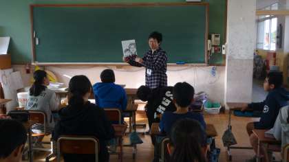 お話の会の方々による朝の読み聞かせ。今日は3・5・6年生の教室に来ていただきました。