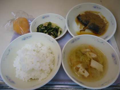 今日は「和(なごみ)献立」でした。「ごはん・さばのみそ煮・小松菜とゆばの煮びたし・白菜の吉野汁・柿」でした。さばのみそ煮は,しょうがや白ねぎを入れて煮ました。少し濃いめの味でごはんもすすみました。京都で昔から食べられてきた「ゆば」や旬の食材の「白菜」「柿」の味を味わえる献立でした。