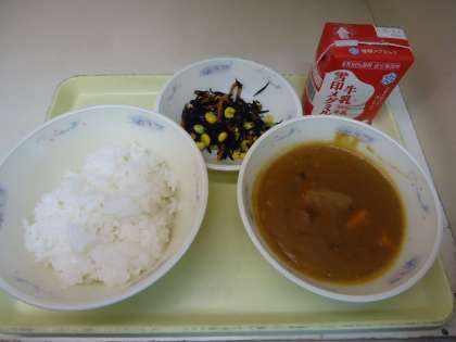 今日の献立は「ごはん・牛乳・カレー・ひじきのソテー」でした。カレーは人気メニューの1つです。給食では,バター・サラダ油で小麦粉を茶色く色づくまでじっくり炒め,カレー粉を加えて微温湯で溶いた脱脂粉乳を少しずつ加えながらなめらかなルーを作ります。「家のカレーよりちょっとピリ辛やけどおいしかった。」と感想を聞きました。