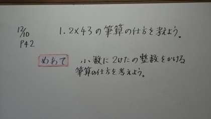 小数の計算の学習です。筆算をどのようにしたらいいかみんなで考えました。繰り返し練習して,しっかりマスターしていきたいです。