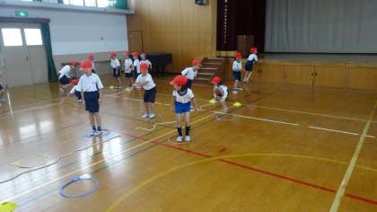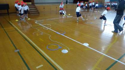 とびくらべの学習です。いろいろな形に用意された場で,いろいろな跳び方に挑戦しています。みんな一生懸命に跳んでいました。