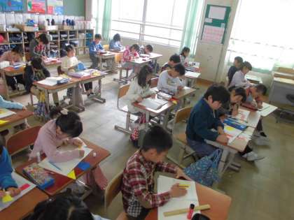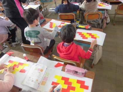 折り紙を切って張り合わせて図形の学習をしました。子ども達は丁寧にはさみを使って正方形,長方形,三角形を切り取っていました。