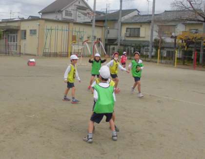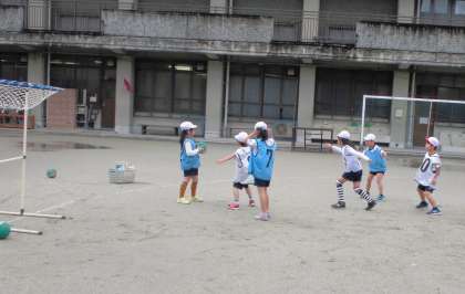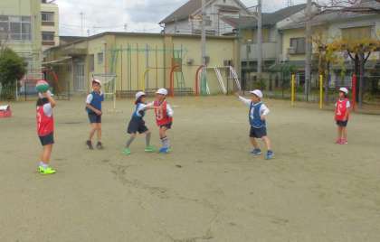 パスゲームの学習をしています。子ども達はグループで作戦を考えて取り組んでいます。