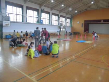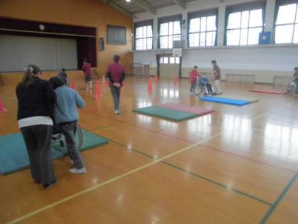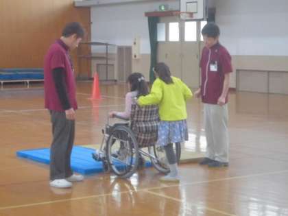 車いすを使って,マットによる段差の悪路やコーンによる進路変更などを体験しました。乗る人の気持ちを考えて,顔の位置で声をかけてから押すなど介助の仕方も教えていただきました。