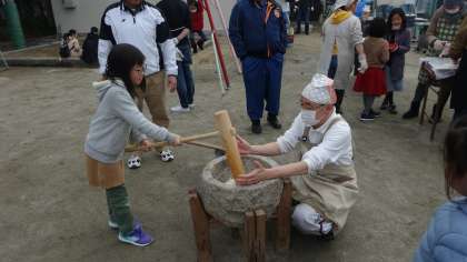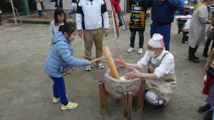 地域の方々におせわになり,本校の運動場でもちつき大会があり,たくさんの人でにぎわいました。子どもたちも実際にもちつきをさせてもらい,楽しいひと時を過ごすことができました。