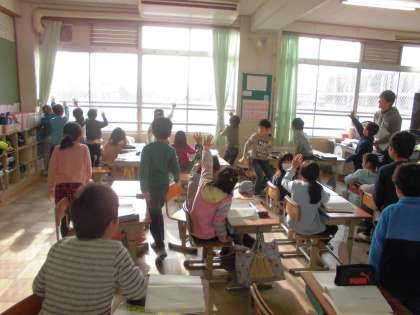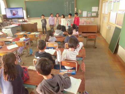 「手のひらを太陽に」の学習をしました。「まっかにながれるぼくの血しお」の意味を確かめるために窓際に移動して太陽に手を透かしてみました。子ども達はグループや全体で読んで楽しみました。
