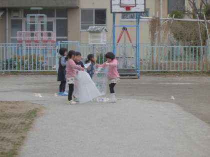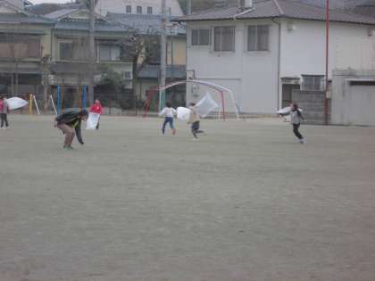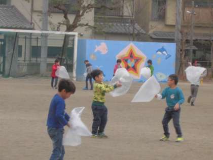 冬あそびを運動場でしました。ビニル袋に空気を入れて楽しく遊びました。