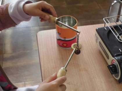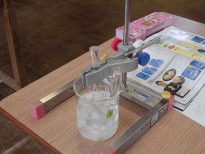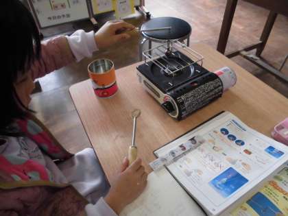 4年生が教室に残り,担任の先生と一緒に理科の実験です。ものが温まったり冷えたりするとどうなるか,実験を通して調べていきました。