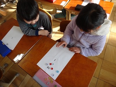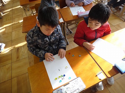 「てんすうを くらべよう」の学習です。「おはじきゲーム」の得点を比べる活動を通して、大きい数の比べ方を考える学習をしました。