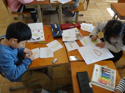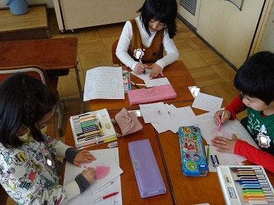 「ものの 名まえ」の学習です。おせやさんごっこの活動に向けて、お店で売る商品を作っています。パン屋に楽器や、本屋、薬局など、楽しいお店がたくさんあります。本番が待ち遠しそうな子どもたちです。