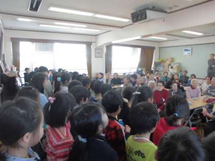 「人にやさしい下鴨の町」をテーマに学習を進めています。今日はすこやかサロンに参加しました。「茶色の小びん」の合奏や「パレードホッホー」,「とんび」の歌を歌ったあと,地域の方にインタビューをしました。地域の方々にとって