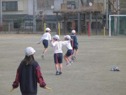 運動場で縄跳びの学習をしました。欠席していた子ども達も登校し,全員がそろいました。寒さに負けず,自分のめあてをもって技の練習に励みました。