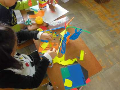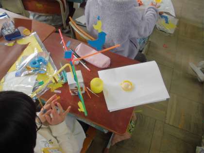 「ストローでこんにちは」の学習をしています。前の時間に動く仕組みを作っているので,今日は飾りをつけました。作品がかなり仕上がってきました。
