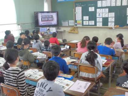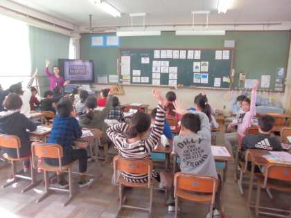 What's this?の学習をしています。電子教材から流れる3つのヒントを聞いて答えました。担任自ら積極的に英語を使って授業を進め,子ども達に英語を使う見本を示しています。