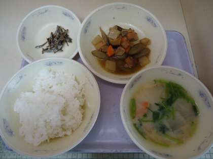 今日は「和(なごみ)献立」で正月料理でした。献立は「ごはん・煮しめ・ごまめ・京風みそ汁」でした。おせち料理には1つ1つ意味や願いがこめられています。「煮しめ」は1つの鍋でいろいろな具を煮るので「家族なかよく幸せに過ごせるように」,「ごまめ」は「五万米」と書き,「田作り」とも言われ,「たくさんお米がとれるように(豊作を願って)」という意味があります。京風みそ汁は,京都のお雑煮に見立てて,里いも・にんじん・だいこん・せりを入れ白みそ仕立てのみそ汁にしました。昔の人の思いを感じながら伝統食を味わって食べてくれていました。