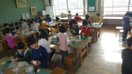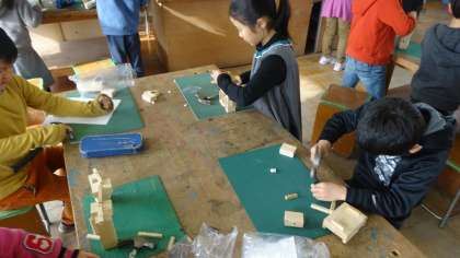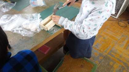釘を金づちで打って,作品づくりです。安全に気を付けながら,真剣な表情で取り組んでいました。