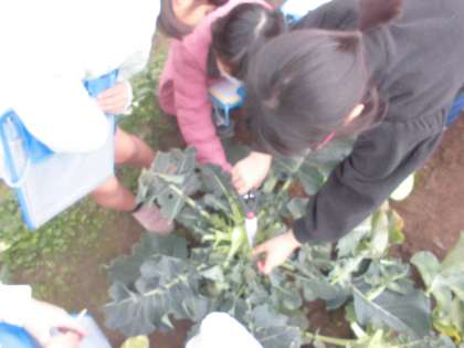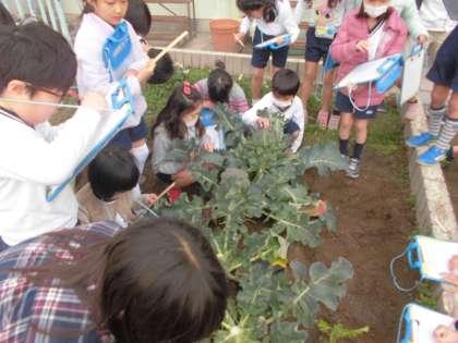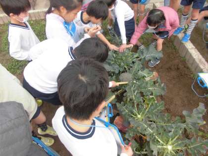ブロッコリーを収穫しました。大きく育ったブロッコリーは15cm程度まで大きくなっていました。収穫したブロッコリーはゆでて給食時間に食べました。