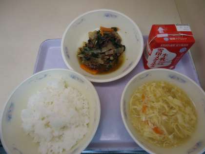 今日の献立は「ごはん・牛乳・プルコギ・中華コーンスープ」でした。プルコギは下味(にんにくと甘辛いしょうゆベース)をつけた牛肉と野菜を炒めて炒りごまを加えて仕上げました。朝鮮半島の代表的な肉料理です。「プル」は火,「コギ」は肉という意味で,日本のすき焼きのようなものです。中華コーンスープは,クリームコーン・たまねぎ・にんじんをチキンスープのだしで煮て,卵を溶きいれて仕上げました。コーンやたまねぎの甘味とふわっとした卵の食感が楽しめました。