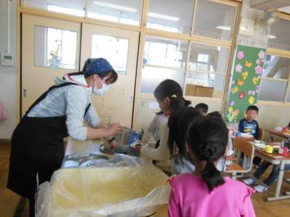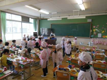 今日から給食が始まりました。1年生は初めての給食で,エプロンの着方や配膳の仕方など,一つずつ確認しながらみんなでがんばっていました。