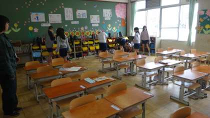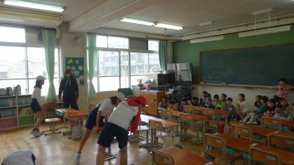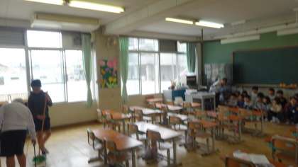 6年生は,1年生の教室で掃除の仕方のお手本を示してくれました。少し照れくさそうにしていましたが,みんな真剣です。