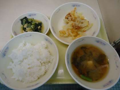 今日の献立は「ごはん・春野菜のかきあげ・小松菜とゆばの煮びたし・みそ汁」でした。春野菜のかきあげは,新たまねぎ・新じゃがいもとちくわ,にんじんを使いました。煮びたしは,ゆばのやさしい甘みやだしの味をしっかり感じながら食べてくれていました。